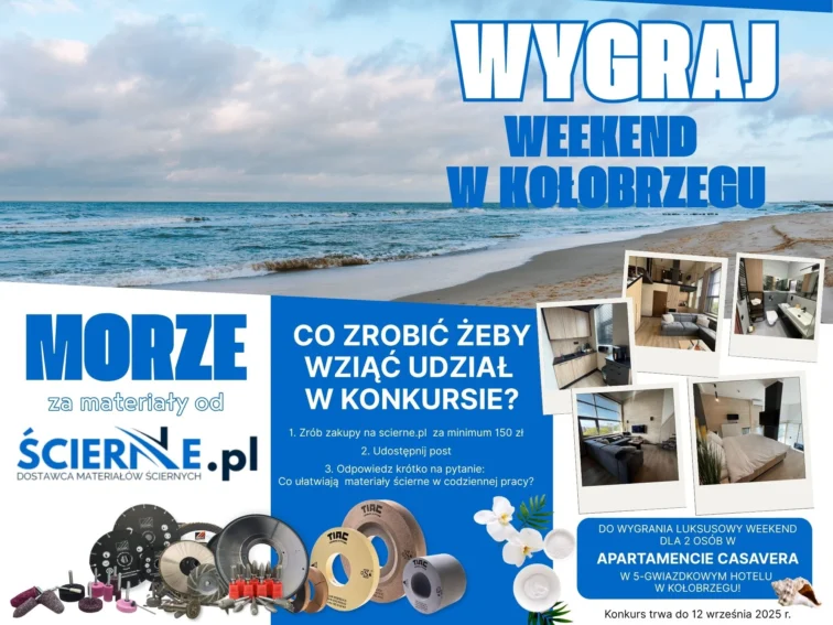 Chcemy docenić Waszą kreatywność i codzienną pracę z naszymi produktami – dlatego każdy, kto zrobi zakupy na scierne.pl i podzieli się z nami, jak materiały ścierne ułatwiają mu pracę, ma szansę wygrać luksusowy weekend w 5-gwiazdkowym apartamencie w Kołobrzegu! 🌊✨